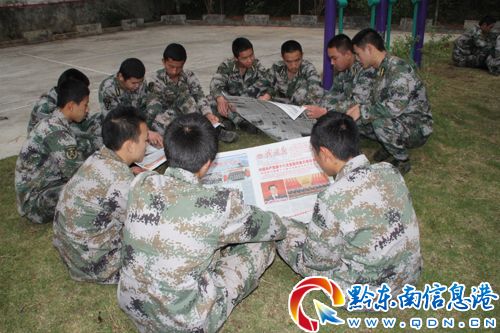 從江縣人武部官兵看報紙學習十八大