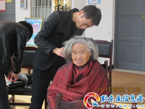 揭牌儀式之后,大家一起來到了丹寨縣福利院為老人和孤兒義務(wù)理發(fā)。部分老人因為聾啞或者行動不便,長時間沒有打理頭發(fā),雜亂的長發(fā)胡亂塞在帽子里,青年們在溫暖的陽光下將老人們的頭發(fā)一絲絲地理順、修理整潔。老人們精神抖擻,孩子們則用臉上最真切的笑容感謝這一群朝氣有愛心青年。(胡荊軍)