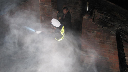 失火地點(diǎn)位于洛香鎮(zhèn)街道的十字路口附近,民警趕到現(xiàn)場(chǎng)時(shí),看到發(fā)生火災(zāi)的四樓民房濃煙滾滾,樓下的街道周圍布滿了很多圍觀的群眾,蒙培林擔(dān)心如果火勢(shì)繼續(xù)蔓延,房屋將可能倒塌的嚴(yán)重后果,立即將民警分為三組,一組民警楊斌、協(xié)勤潘福生,負(fù)責(zé)疏散圍觀群眾和維護(hù)交通秩序。二組民警由李洪東和何文兵組成,負(fù)責(zé)聯(lián)系收費(fèi)站灑水車趕到現(xiàn)場(chǎng),并指揮灑水。蒙培林則帶領(lǐng)潘年廣、龍安洲、韋陽銘、楊克軍沖上與火災(zāi)的四樓比鄰的樓頂,協(xié)同洛香鎮(zhèn)派出所和群眾一起展開救火行動(dòng)。經(jīng)過一個(gè)多小時(shí)的撲救,雖然火勢(shì)慢慢退下來,但是始終沒有完全被撲滅,且濃煙越來越大,民警潘年廣懷疑失火的房間里可能還有易燃物品,于是叫上中隊(duì)民警龍安洲一起從樓頂跳進(jìn)失火的房間里,原來,在房間的角落里放著一大堆干燥的柴火,因?yàn)楸煌咂w住,水根本灑不到柴堆里,于是,潘年廣和龍安洲用膠管從水龍頭里接水灑向柴堆,并用木桿將柴堆分散,最后的一片火勢(shì)終于被徹底撲滅。(韋陽銘 攝影報(bào)道)