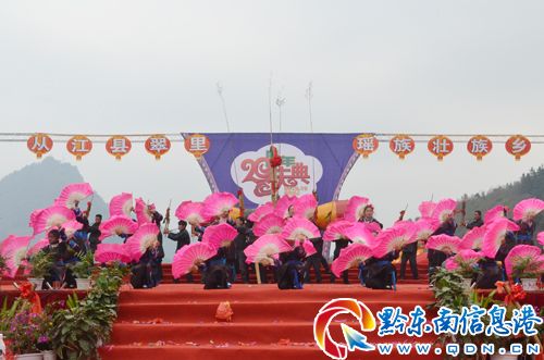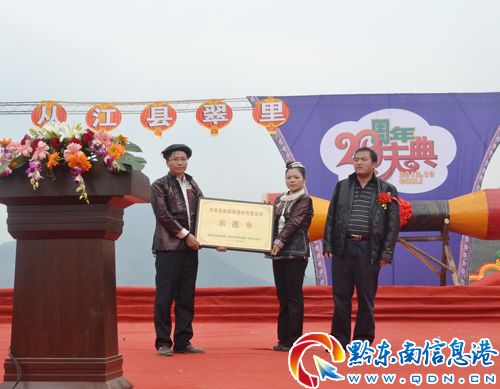 儀式上,省民委為獲得全省民族團(tuán)結(jié)示范鄉(xiāng)——翠里鄉(xiāng)進(jìn)行授牌;從江縣委縣政府、剛邊壯族鄉(xiāng)、秀塘壯族鄉(xiāng)等民族鄉(xiāng)向翠里鄉(xiāng)受祝賀匾。