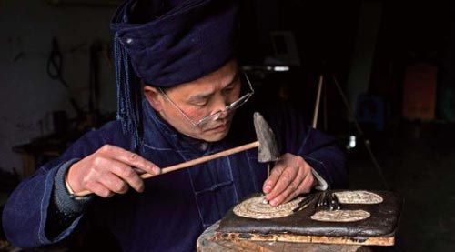 雷山西江鎮控拜村、麻料村、烏高村有500多年的銀飾工藝歷史,村里的成年男子大都能掌握打制銀飾技術。他們從小學藝,世代承襲,至今仍是手工打制,形成鑄煉、錘打、編織、洗滌等一整套工藝流程。打制工具主要包括:火爐、風箱、蠟鍋(俗稱“銀鍋”)、鐵錘、鐵鉆、鐵橙、沖具、刻刀、絲眼板、銅盆、鉗子、鑷子、油燈、吹管、紋樣模具等。銀飾加工從熔銀至完成需要8道工序,其基本流程是:熔銀、制條料、制絲料、制片料、壓花、編織、裝配、清洗等。
