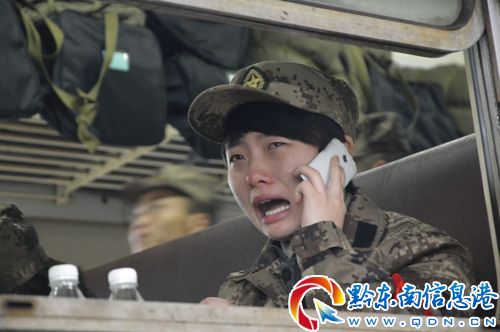 火車臨開之際,女兵與親友通過電話道別,忍不住淚雨滂沱