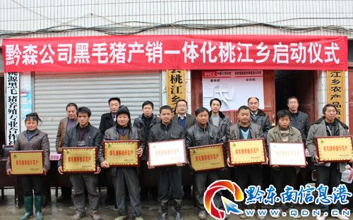 12月29日,黔森公司黑毛豬產銷一體化啟動儀式在桃江鄉舉行,黔東南黔森綠色生態產業開發實業有限公司無償發放價值2萬元的“短嘴黑毛豬”40頭給掌雷村農戶(示范戶)養殖。公司董事長蒙小林,桃江鄉鄉長王勛建、縣有關部門領導出席儀式。
