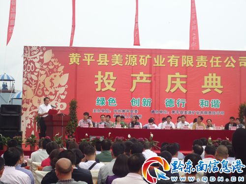 5月16日,陽光明媚,鳥語花香,對上塘人民來說是個值得慶賀的好日子,黃平縣美源礦業投產慶典儀式在這里盛大舉行。三年前的今天,黃平縣美源礦業公司破土動工,三年磨一劍,昔日的荒山變成了此時有林立廠房的黃平縣美源礦業公司。當日,應邀出席慶典儀式的領導有:州委副書記楊華昌,常務副州長馮仕文,原黔東南州政協主席鄧錦州,州人大常委會副主任唐斌,州政協副主席吳仕倫,州政協副主席、州工商聯主席胡國珍,原黔東南州政協副主席楊昌忠,省經濟和信息化委高工張慧林。黃平縣委書記吳克、林昌富、馬劍英、戴黔生等縣領導出席。同時還邀請了許多省內外嘉賓。
