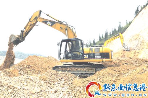 岑鞏縣金源冶金有限公司辦公大樓、職工宿舍樓和食堂工程,挖掘機正在削峰填谷平場
