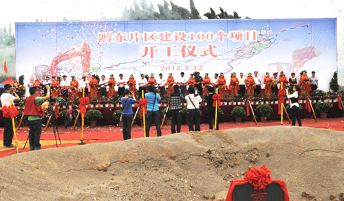5月12日,黔東循環經濟工業園區彩旗飛揚,黔東片區100個項目在這里隆重舉行開工儀式。中共黔東南州委書記廖少華、中共黔東南州委副書記、州長李飛躍等州四大班子領導,和來自岑鞏、鎮遠、三穗黔東片區黨政主要負責人、黔東循環經濟工業園區相關負責人和工商企業界代表等近千人出席開工儀式。