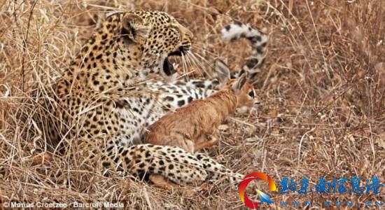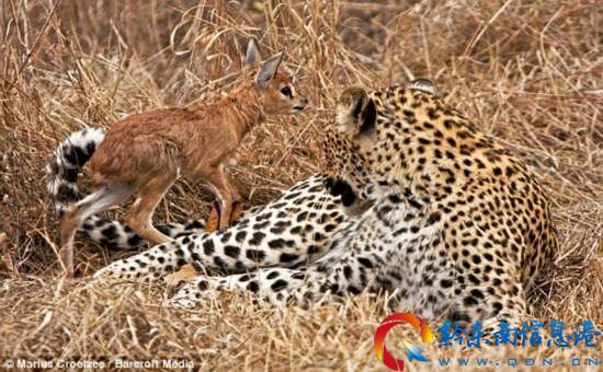 近日,南非薩比桑德野生動(dòng)物保護(hù)區(qū)(Sabi Sand Game Reserve)的導(dǎo)游Marius Croetzee,近日在保護(hù)區(qū)拍到獵豹和小羚羊短暫成為朋友的罕見(jiàn)畫面。一只剛出生不久的小羚羊離開母親,遇到一只母豹,它非但沒(méi)有膽怯遇到殺手,還湊到獵豹的懷中,準(zhǔn)備吃奶。這只獵豹開始時(shí)沒(méi)有將它當(dāng)作美餐,而是和它向朋友一樣玩了45分鐘。但最后,母豹終于露出兇殘一面,瞬間將羚羊咬死吃掉。