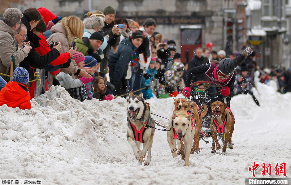 當地時間2012年1月28日,加拿大魁北克城,魁北克冬季嘉年華上,狗狗在老魁北克街進行雪橇犬比賽。