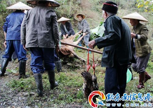 11月16日,劍河縣革東鎮八郎苗族大寨舉行重大的“洗寨”活動。這天細雨紛紛,對于“洗寨”的八郎苗寨來說是個非常吉利的日子,“風調雨順、平安無事”。這天全村男女老少大清早就起來忙乎著,村里安排人把守村寨周圍大小進出口,不準外村人進入寨子。天一亮,各家各戶抓緊煮飯、煮豬潲。吃完早飯后,全寨各家各戶的灶堂、火坑的火種必須全部撲滅。洗寨時男性大人小孩參加,女性不參加,婦女可以上山干活,可以在家,但不許生火,不許互相走動。