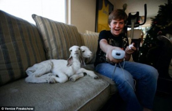 2010年,托德的兒子菲尼克斯與一只雙頭山羊坐在沙發(fā)上