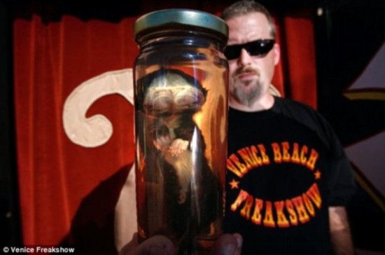 除了活的雙頭動(dòng)物外,托德還保存了大量雙頭動(dòng)物標(biāo)本。直到最近,他才在威尼斯灘怪物展上展出“杰克琳&海德”。他在接受《赫芬頓郵報(bào)》采訪時(shí)說:“我必須讓它們適應(yīng)怪物展。‘海德’眼里有沙子,一切行動(dòng)只能聽‘杰克琳’指揮。松獅蜥的世界充滿沙子,本來沒什么大不了的,但雙頭松獅蜥比較特別。它們的前主人用對(duì)待單頭爬行動(dòng)物的方式對(duì)待它們,因此效果不佳。經(jīng)過治療,‘海德’的眼睛好多了。”