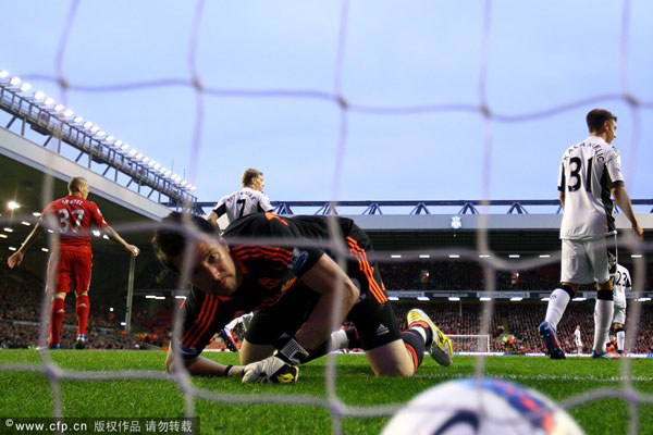搜狐體育訊 北京時間5月2日凌晨2點45分,2011/12賽季英超聯賽進行一場第34輪補賽,利物浦坐鎮安菲爾德球場0-1不敵富勒姆,吃到主場兩連敗,這也是紅軍史上首次主場負于富勒姆。第5分鐘,斯科特爾自擺烏龍助富勒姆攻入全場唯一進球。