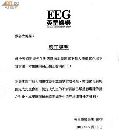 英皇娛樂(lè)發(fā)出的嚴(yán)正聲明指,陳偉霆從不認(rèn)識(shí)劉定成,也從來(lái)沒(méi)有與劉會(huì)面。聲明指劉定成的不實(shí)言論已嚴(yán)重影響陳偉霆之形象,該集團(tuán)會(huì)保留向劉追究法律責(zé)任之權(quán)利。陳偉霆昨響應(yīng)事件時(shí)也表明:“絕對(duì)沒(méi)有這件事,不明白為什么有人拿我來(lái)開(kāi)玩笑,但公司連到底有沒(méi)有這件事都沒(méi)有問(wèn)過(guò)我!”英皇藝人管理及唱片部總監(jiān)霍汶希也怒轟:“這個(gè)人的言論不可信,影響到公司旗下藝人!”