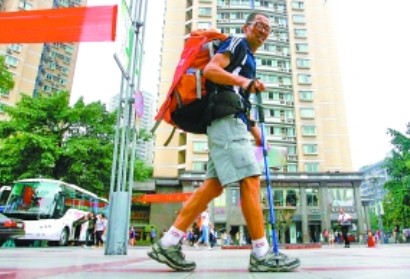 昨天上午,一位戴著眼鏡、身穿深藍色T恤和灰色短褲、背著登山包的老人出現在三峽廣場,引來路人注目。他就是有“中國阿甘”之稱的陜西老人金世民。老金剛過60歲,已徒步8萬多公里,他的目標是走完國內2500個縣市。這是他第三次來渝了,一路都有熱情的重慶驢友接待他。