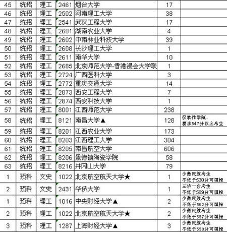理工類缺額較多的省外院校有合肥工業(yè)大學(xué)(宣城校區(qū))44人、東北林業(yè)大學(xué)41人、中南林業(yè)科技大學(xué)39人、河南理工大學(xué)和石河子大學(xué)均缺額38人,省內(nèi)院校缺額較多的有南昌航空大學(xué)606人、江西理工大學(xué)304人、江西師范大學(xué)238人、江西農(nóng)業(yè)大學(xué)173人、南昌大學(xué)128人(僅軟件學(xué)院,要求547分以上考生)。