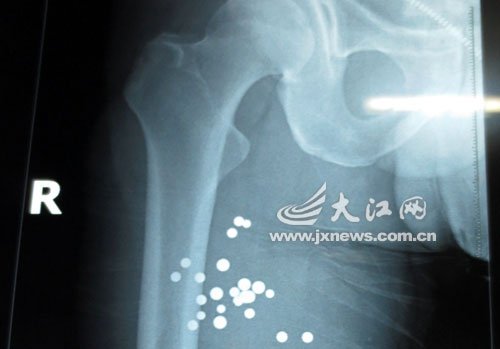 據武警江西總隊醫院燒傷整形手足外科醫師劉序介紹,鄢先生剛剛被送來時,出現了失血性休克,情況十分危急。經過迅速的清創和拍片后,確定了鄢先生的傷勢:右腹和右腿部位有貫穿傷,通過拍片發現體內有一大片鋼珠,“右腹部位從左上側貫穿到肋骨,兩根肋骨骨折,鋼珠反彈后到達左下側;右腿從前內側到后內側有貫穿傷。”