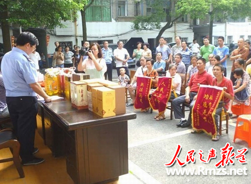 8月14日下午,湖南衡陽縣公安局西渡中心派出所院內人潮涌動,熱鬧非凡,"6.26"系列盜竊案退贓大會在這里如期舉行,前來領取被盜財物的失主紛紛以燃放鞭炮、贈送錦旗的方式,表達對民警的謝意。