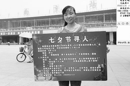 昨天中午12點多,南京網友@現代快報趙杰在新浪微博發出圖文并茂帖,文稱“來自河南周口的杜薈芳在南京火車站廣場舉牌尋找她在8月12日廬山游玩時,相伴游玩一天的南京小伙子。”