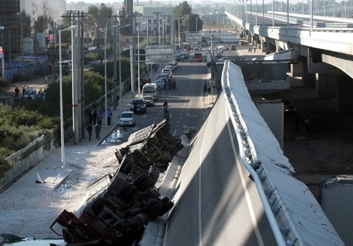 8月24日5點30分左右,哈爾濱陽明灘大橋疏解工程一上行匝道垮塌,橋上4輛貨車側翻至橋下,致使3人死亡5人受傷。