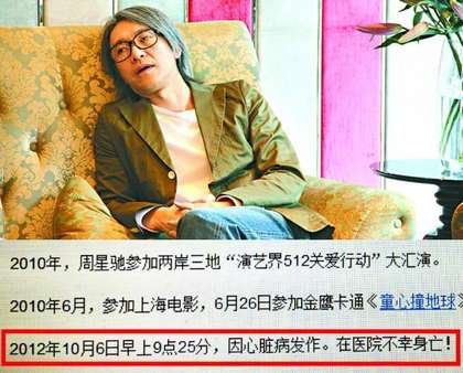 百度網(wǎng)站上的背景資料上寫著“2012年10月6日早上9點25分,因心臟病發(fā)作,在醫(yī)院不幸身亡。”一些粉絲也都半信半疑,但經(jīng)查證星爺平安。網(wǎng)友惡搞星爺死訊,下午3時左右,網(wǎng)站已移除該內(nèi)容,粉絲提醒彼此要冷靜,不要輕信謠言。