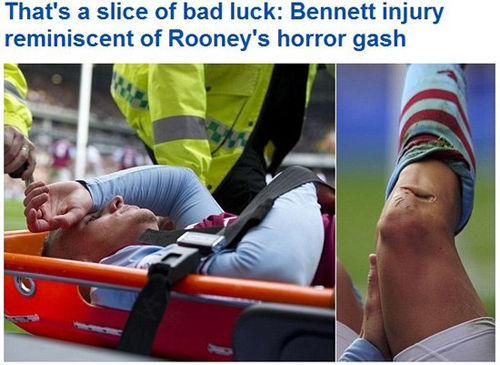從《每日郵報(bào)》給出的圖片來(lái)看,雖然傷口沒(méi)有鮮血涌出,但長(zhǎng)長(zhǎng)的口子和傷口的深度卻讓人倒吸了一口涼氣。隨后維拉隊(duì)醫(yī)對(duì)其進(jìn)行了簡(jiǎn)單處理,本內(nèi)特也被擔(dān)架抬下,然后直接送往醫(yī)院進(jìn)行縫針。究竟這道恐怖的傷口是何所致,《每日郵報(bào)》認(rèn)為有可能是被場(chǎng)邊廣告牌劃傷,也有媒體認(rèn)為是被貝爾的鞋釘踹到。