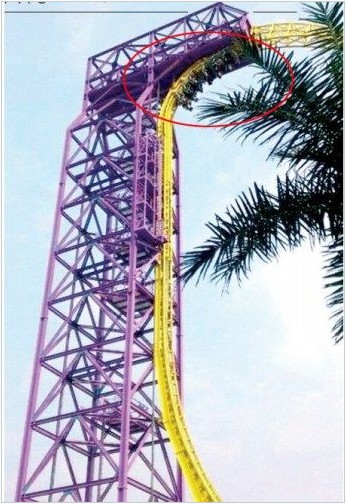 一名曾懸在空中的游客說:“我當時坐在最后一排,狀態是面對著天,背對地,靠在座椅上。之后車繼續向高處滑行,在接近最高點時,突然卡在空中不動了,先有兩三秒鐘,大家都沒吭聲,但在空中停止近10秒,大家開始恐慌不安。坐在第一排的人頭朝下,身體的全部重力靠腹部的一個環狀安全護欄支撐。機器重新啟動后,我們才回到地面上。”