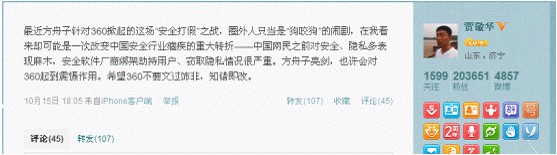 10月15日晚,知名IT評論家賈敬華就“方周大戰(zhàn)”發(fā)表評論稱:最近方舟子針對360掀起的這場‘安全打假’之戰(zhàn),圈外人只當是‘狗咬狗’的鬧劇,在我看來卻可能是一次改變中國安全行業(yè)痼疾的重大轉(zhuǎn)折——中國網(wǎng)民之前對安全、隱私多表現(xiàn)麻木,安全軟件廠商綁架劫持用戶、竊取隱私情況很嚴重。方舟子亮劍,也許會對360起到震懾作用。希望360不要文過飾非,知錯即改。