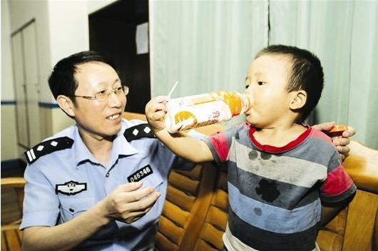 圖為:兩年前,交警為“撿”來的朱俊喂飲料(資料圖片)