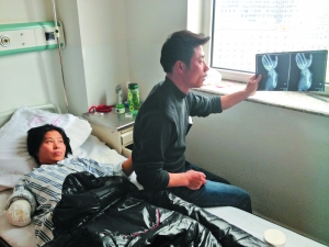 昨日,劉海云躺在病床上,丈夫王全校拿著她的斷臂X光片心疼不已本報記者唐奇攝