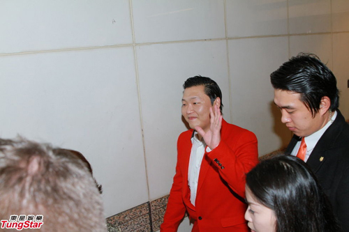 晚上約8時,換了一身火紅西裝的PSY乘車前往灣仔碼頭,在車上摘下招牌黑超的他似乎極疲倦,其后他戴回黑超下車,見記者在場他笑著揮手,之后便上了游艇,夜覽香港景色。