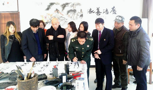 劉瀚鍇與著名音樂人劉尊,青年歌手郭彤,詩人岳英春等觀看著名軍旅書畫家許四海現(xiàn)場創(chuàng)作.