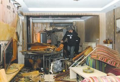 爆炸威力現(xiàn)場清晰可見:該屋朝西向是草坪和小區(qū)道路,可看到陽臺門和玻璃窗全部洞開,里面漆黑一片,窗簾被炸飛落在門口的綠化帶和樹枝上。屋內各式家當物品凌亂堆積,墻上的電視被炸塌毀壞,吊頂撕裂下墜,裸露在外的電線扯掛在倒地的桌椅上。