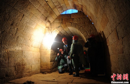12月30日,重慶市彭水縣在山谷公園建設施工過程中發掘出一座地下石墓。這座墓穴結構分為墓道、墓門、甬道、墓室以及棺床等附屬設施。通長有15.8米、最寬處2.8米、墓室內高3.1米。由于墓室已經遭遇過多次盜墓,墓室內的棺槨和陪葬器具都所剩無幾,不過,根據墓室的規格和建造方式,考古工作人員初步推斷,墓室的主人應該是蜀漢末年彭水縣擔任地方長官的行政官吏。是目前發現的渝東南地區最大的漢代石室墓。圖為考古工作人員正在給市民介紹石室墓。(陳超 攝)