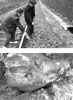 一塊一米見方估計有千斤重的巨石,斜靠在鐵軌的彎道內(nèi)側(cè)。