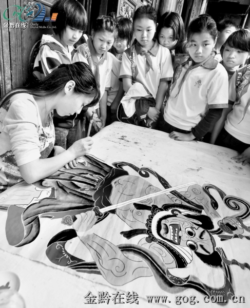 圖:6月3日,眾多學生正在觀看儺戲堂案繪制。