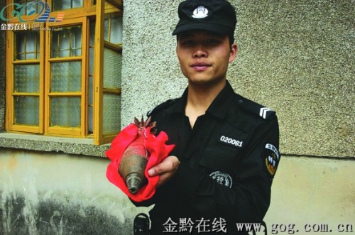 獨山縣城關鎮一村民拾得一個鐵疙瘩,當成“古董”收藏了一年多,后來才知“古董”是一顆日軍留下的炸彈,7月11日,村民將炸彈交警方處理。