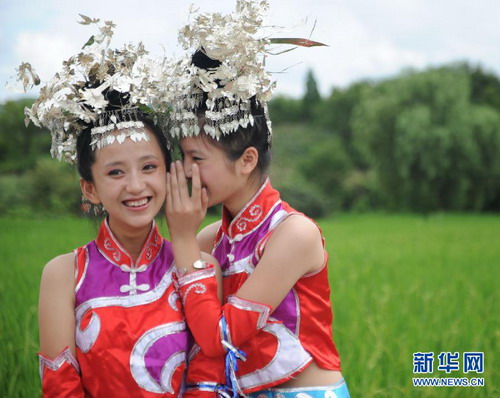 7月29日,身著盛裝的水族少女在卯節上悄聲耳語