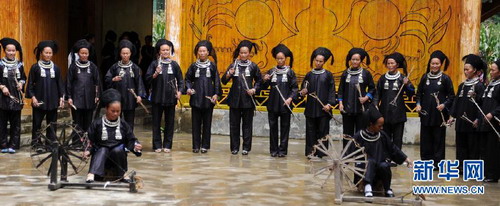 貴州三都縣水各鄉的水族同胞在卯節活動上表演“紡繡舞”
