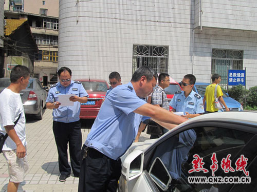 在州醫院門前,人行道被占的現象突出,停放著車輛,旁邊還設攤點,將人行道占去了一大半,行人只有錯雜其中,十分擁擠,嚴重影響了正常的交通秩序。城管和交警立即上前告知車主和攤主不能將車子停在人行道上、桌椅擺在人行道上,給沒有人的車子貼上警告。