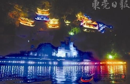 夜晚的鎮遠青龍洞道觀景區,恢弘建筑高懸絕壁