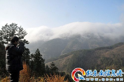 12月14日,鎮遠縣境內多處起霧,而在該縣舞陽鎮境內的胡家坡、馬郎坡一帶驚現霧海云山奇觀,從中午時分持續至下午5時許才結束。鎮遠一些攝影家獲知消息,立即趕赴現場拍攝。記者在現場看到,大量的霧緊緊“裹”著山峰,久久不散,而在山峰頂上,則是蔚藍的天空。(何昌華 羅茜)