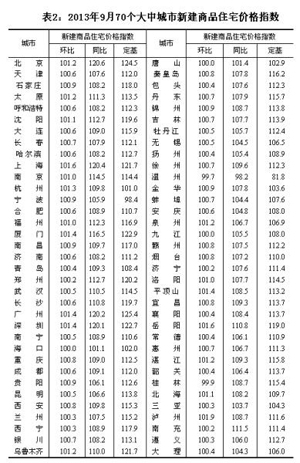 10月22日 國家統(tǒng)計局今日發(fā)布2013年9月份70個大中城市住宅銷售價格變動情況。數(shù)據(jù)顯示與上月相比,70個大中城市中新建商品住宅價格上漲的城市有65個。環(huán)比價格上漲的城市中瀘州漲幅最高,為1.9%。與去年同月相比,70個大中城市中新建商品住宅價格下降的城市有1個,上漲的城市有69個,北京上漲幅度最高,為20.6%。