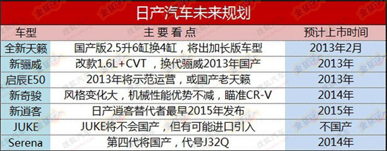 動力方面:國產的天籟會將2.5升V6發動機換為4缸發動機,而2.0升發動機則進行動力升級。這些車型都匹配CVT無極變速箱。同時可能會首次在天籟車型上搭載混合動力技術。