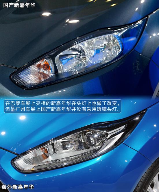 外觀方面:國產全新嘉年華采用全新前臉設計,有兩種高低不同配置的前大燈設計,低配版延續現有的反射式遠近光設計,高配版本的近光燈組升級為投射式的透鏡大燈,燈組下沿長條形的LED日間行車燈配置。依然配置195/50 R16規格的輪胎,但新的15輻條的鋁合金輪轂頗具中高級車型的風。
