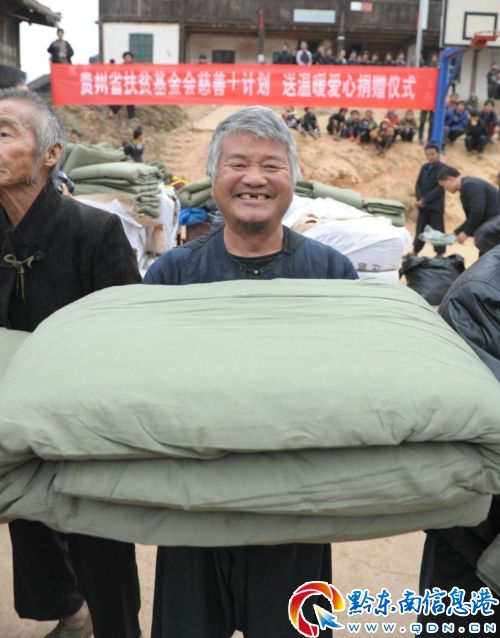 1月30日,貴州省扶貧基金會在從江縣丙妹鎮大歹村開展“慈善+計劃 送溫暖愛心”活動,捐贈儀式上,該基金會為大歹村民送去了價值6萬元的400床棉被和衣物。