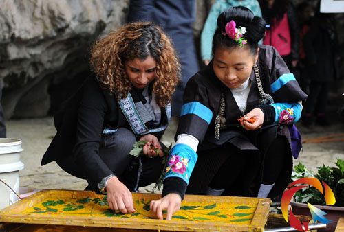 參加“2013年駐華使節(jié)走進(jìn)中國文化遺產(chǎn)”活動(dòng)的各國使節(jié)在丹寨縣南皋鄉(xiāng)石橋村感受古法造紙制作技藝