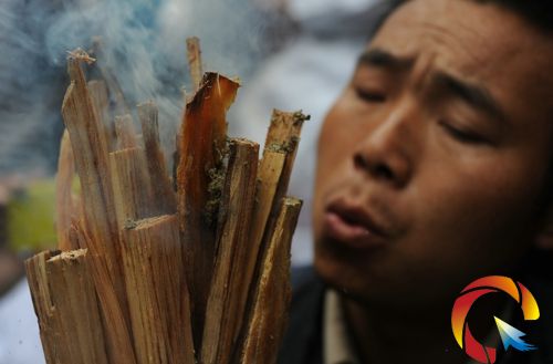 一名苗族村民在祭尤節(jié)的祭祀儀式上用傳統(tǒng)的方式點(diǎn)燃祭火