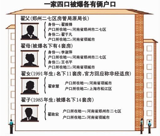 去年12月26日晚,實名認證微博香港成報河南辦事處爆料稱,河南鄭州二七區房管局原局長翟振鋒之女翟家慧在鄭州擁有11套經適房,其中最大的一套258平米。爆料還稱,翟家慧有兩個戶口,均不在鄭州,而是在周口市項城公安局南關派出所和上海公安局松江分局大學城派出所。并在28日曝光了其門牌號;30日,知情人爆料,鄭州房妹全家雙戶口,全家共有31套房產。