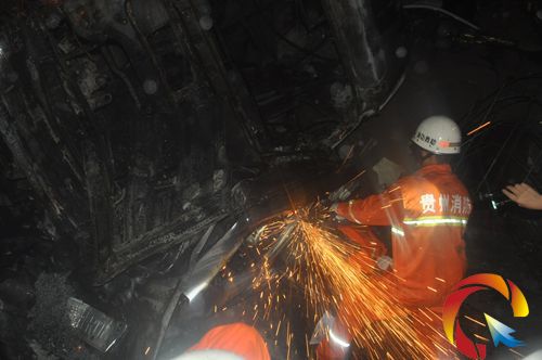 9月2日晚20時26分,黃平縣消防大隊接到報警稱,重安鎮馬場村306國道石頭田組路段,一輛滿載空啤酒瓶的大貨車發生側翻,壓住兩輛小車起火燃燒,車內有人員被困。
