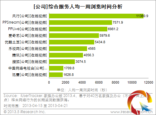 北京 2013-05-14(中國商業(yè)電訊)--艾瑞IUT 4月份第三周網(wǎng)絡(luò)視頻用戶數(shù)據(jù)調(diào)查數(shù)據(jù)日前出爐。與前一周綜合服務(wù)瀏覽時長排名相比,PPTV超過愛奇藝躍至第三位。優(yōu)酷土豆仍據(jù)榜首,風(fēng)行網(wǎng)繼續(xù)位列次席。在人均一周瀏覽時長方面,風(fēng)行網(wǎng)仍以大幅優(yōu)勢領(lǐng)跑,將被百度收購的PPS穩(wěn)居第二,而優(yōu)酷土豆僅排名第五位,且人均時長不足風(fēng)行網(wǎng)半數(shù)。